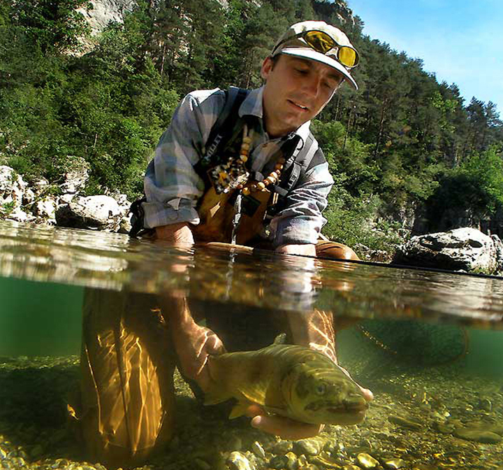 Scrambling down the steep escarpment we found ourselves at the water's edge. A secretive sort of place cloaked from the world by woodland and never more than twenty metres of visible waters before disappearing round another tortuous twist in the Gorge - and what fish-holding lies these boulder-strewn stretches produced. Pascal Vernier the local guide was already there to greet us accompanied by two Dutch clients. They were halfway through their evening session - half a dozen fish between them including a couple of forty centimetre specimens. Like all the local guides I was to meet, Pascal was an expert practitioner of 'nymph a vue'. Nine foot cane, five weight floater, very long tapered leader and the finest of tippets topped by size 18-20 nymphs. And in the mountain clarity of water, you just target your fish. Simple enough? You must be joking - my first attempt was farce!