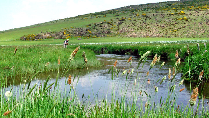 Aubrac: this was Arnaud Pelegrin's territory; a wonderful 1400 metres high plateau of meadows, wetlands and moorlands networked by springs and streams that meld into the Bess. This particular stretch was at the moor's edge, and again, of an altogether different character from the day's previous rivers, and Arnaud had made time to give me the guided tour. The waters were peat stained, broadish, the flow interrupted by small granite obstructions - the last gentle gradations before tumbling from the plateau to a far more torrential form. But here, the topography produced an interesting variety of pools and placid runs and rising, tricky critters of up to thirty centimetres (sometimes forty in early spring) This was more like familiar territory; a sort of grander, more dramatic Dartmoor at altitude, and certainly the promise of bigger fish. I'd wandered off to make my mistakes in private and found a treasure of a spot; mayfly appearing in early evening light above a long gliding stretch which at the tail disappeared over a rocky chute - intermittent but confident risings alongside the opposite bank. Too many obstacles to cast across, so back to the chest waders. Very carefully I'd picked a passage to mid stream; thigh deep and in Quasimodo mode I targeted my mayfly at a riser (damn! - even the finest of leaders look like hawser in the glassy meniscus) Then a simple sip and the mayfly disappeared, my rod bowed in acknowledgement - suddenly springing back to attention - the Zebra gone. 'Savvy and fighting fit, eh? I'll show you'!