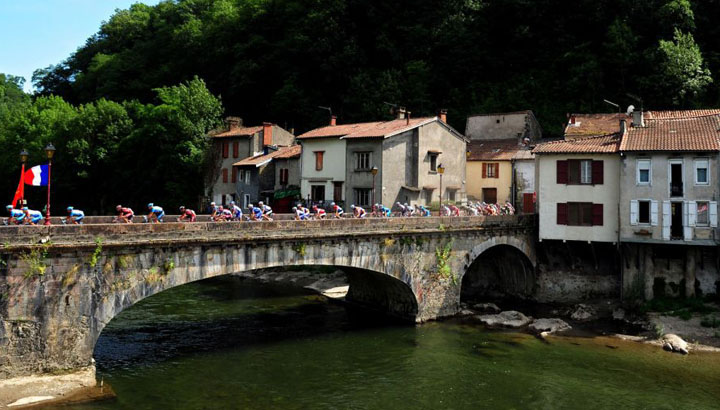 St Giron, in the region of Arriege: it's an old river town an hour and half's drive south of Carcassone, and we hit it around lunch time in time to see the tail-enders of a cycle race pass over her bridge.